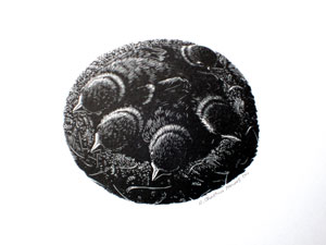 Wood Engravings are traditionally done in black and white and are quite small due to the medium. They are made using very hard wood such as Box wood, with small chisels which cut away the white parts of the designs. A roller is used to ink up the wood block. This layer of ink sits on the top of the wood and does not enter the cut lines. This method of printing is called Relief and applies to lino cuts and woodcuts.